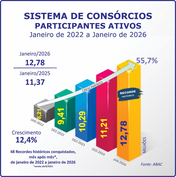 O aumento nas vendas de cotas em diversos segmentos, bem como eventuais retrações em outros, sinalizam características comuns em início de ano, em razão do número de dias úteis, férias etc., todavia, ao atingir 12,78 milhões de participantes ativos, em janeiro, bateu novo recorde histórico e registrou alta de 12,4% sobre os 11,37 milhões alcançados no mesmo mês do ano passado.
