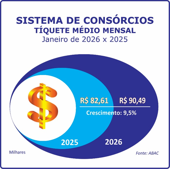 O tíquete médio de janeiro foi de R$ 90,49 mil. Houve alta de 9,5% sobre o do mesmo mês de 2025, que na ocasião apontou R$ 82,61 mil. O aumento confirmou o interesse do brasileiro por cotas de maior valor, que, a despeito de serem cada vez mais altos, esteve compatível com o bolso dos consorciados.